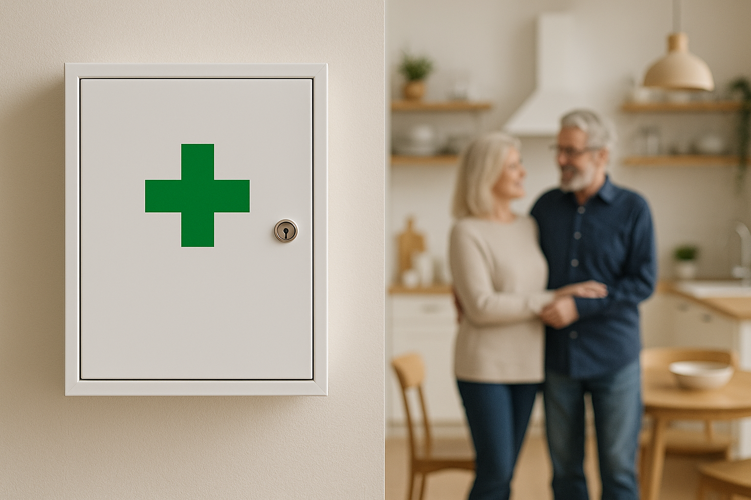Weiße Verbandschränke mit grünem Kreuz für Wohnraum, Küche oder Flur, komplett bestückte Erste-Hilfe-Sets für den Haushalt sowie praktische Nachfüllsets und Ergänzungen wie Kinderpflaster, Kühlkompressen und Verbandmaterial – alles passend für Familien und Mehrgenerationenhaushalte.